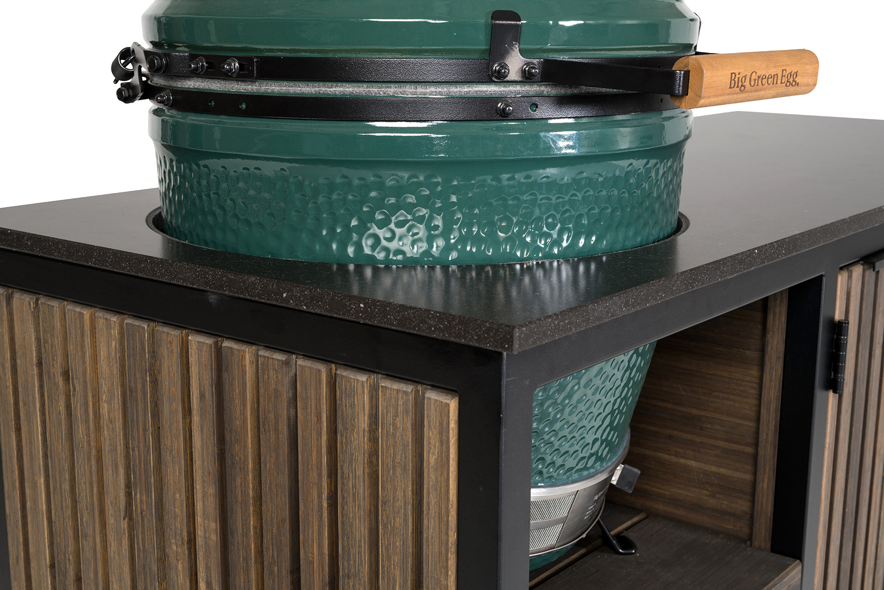 Combinatiedeal voor de Big Green Egg Large + Fraaii Tafel Bamboo Graphite Rhombus Inferno. Het frame van de Fraaii Tafel Bamboo Graphite Rhombus Inferno is gemaakt van zwart gepoedercoat staal en uitermate geschikt om gedurende alle seizoenen buiten te gebruiken. De houten inleg is gemaakt van bamboe hout. Op het Dekton werkblad heb je voldoende ruimte om gerechten te bereiden of bbq accessoires neer te leggen. De tafel biedt voldoende opbergruimte en de 4 zwenkwielen zorgen ervoor dat je de hem gemakkelijk kunt verrijden naar iedere gewenste plek in de tuin. De tafel is standaard uitgevoerd met mat zwarte handgrepen.