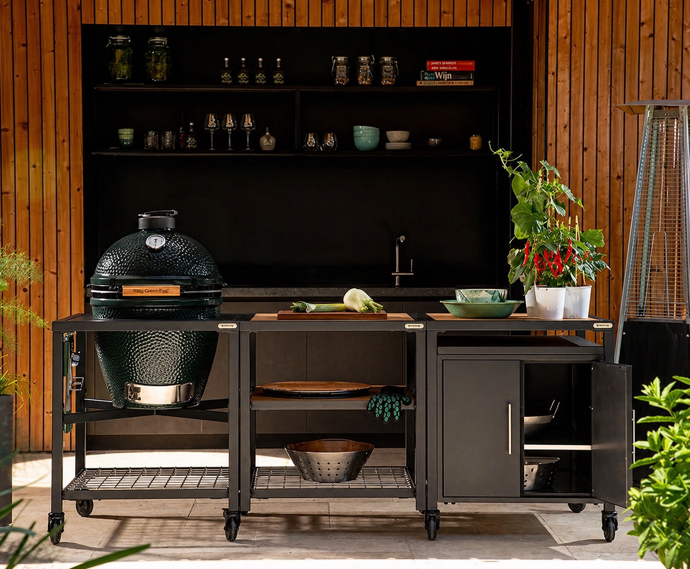Het modulaire tafelsysteem van Big Green Egg is de ideale buitenkeuken opstelling. Nog meer kookplezier en bovendien veel meer werkruimte. Om het je gemakkelijk te maken hebben we bij BBQ Green Egg Store diverse opstellingen voor je geconfigureerd. Zo hoef je niet zelf aan de slag maar is het modulaire tafelsysteem direct volgens jouw wens samengesteld. Afmetingen modulair systeem: 150 cm x 75 cm x 88 cm.