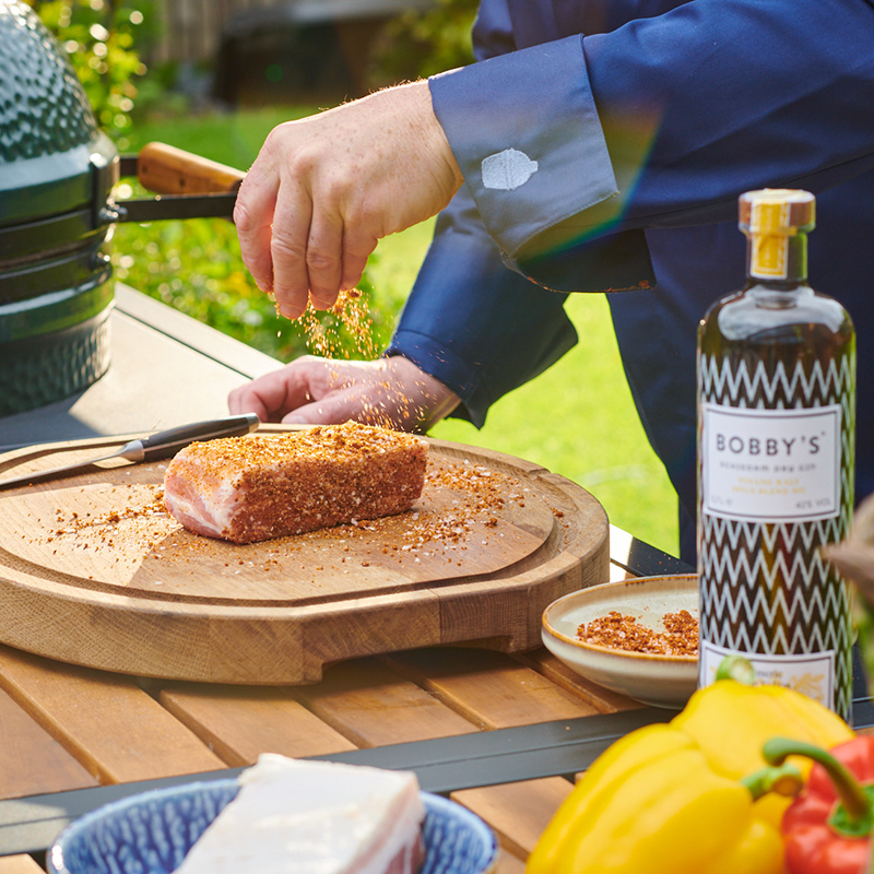 Steek de houtskool in de Big Green Egg aan en laat de temperatuur oplopen tot ongeveer 160 °C. Haal het buikspek uit de pekel en dep het droog met keukenpapier. Snijd het in twee gelijke stukken, zodat je later mooie plakjes kunt snijden die rondom bedekt zijn met rub. Wrijf het vlees in met ongeveer vier eetlepels van de rub; wat je overhoudt, kun je bewaren voor de volgende keer.