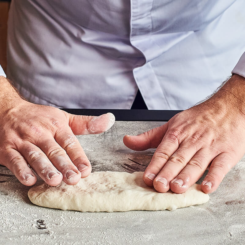 • Haal drie van de deegstukken uit de koelkast en snijd ze elk twee keer in de lengte in met een scherp mesje. Til voorzichtig de hete Baking Stone op (gebruik hiervoor de EGGmitt) en giet 100 milliliter water in de skillet. Wees voorzichtig, want de skillet is zeer heet en er zal direct stoom ontstaan. Leg de Baking Stone terug en leg de deegstukken erop. Sluit de deksel van de EGG en breng de temperatuur terug naar 250 °C. Bak de baguettes in ongeveer 20 minuten goudbruin en gaar.