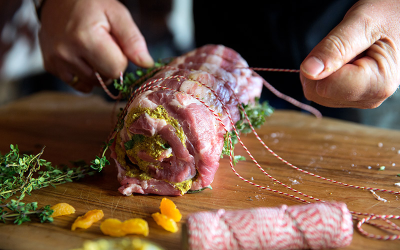 - Steek tussen het vlees en het touw wat takjes citroentijm.